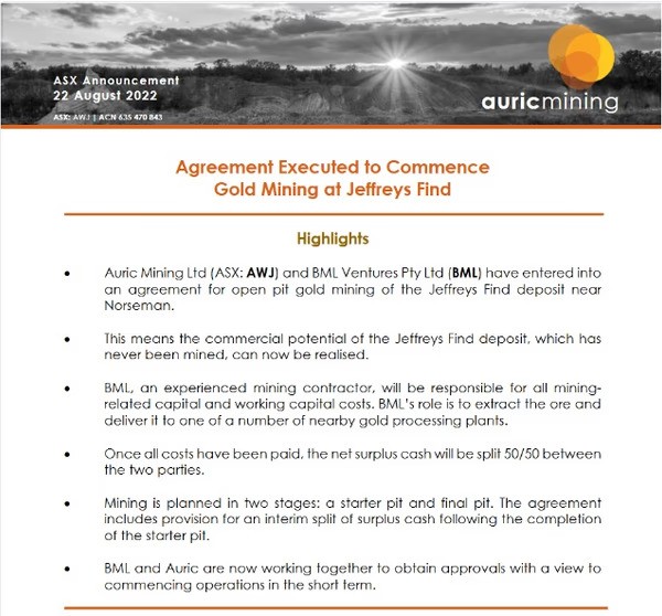 BMLV sign agreement with Auric Mining to mine/profit share Jeffreys find deposit