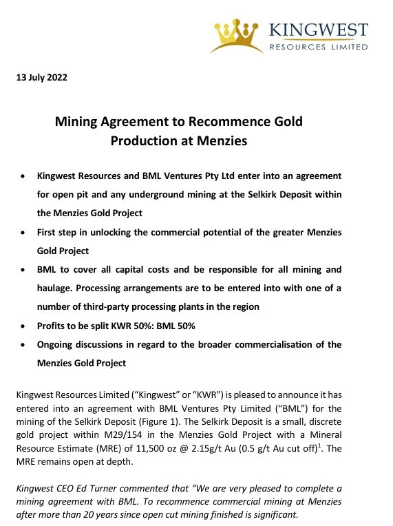 BMLV sign agreement with Kingswest (now Brightstar) to mine/profit share Selkirk deposit