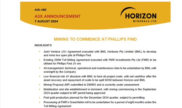 Second Mining fleet starts at Phillips find (Horizon Minerals)