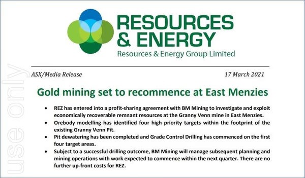 BMLV sign agreement with Resources and Energy Group (REZ) to mine/profit share Granny Venn project.